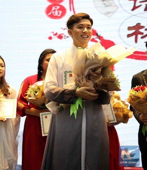 Student Le Anh Duc of the Hanoi University receives the arward after wining the first prize in the qualifying round of the 17th "Chinese Bridge" held in Hanoi, Vietnam, on May 25, 2018. (Xinhua/Yan Jianhua)