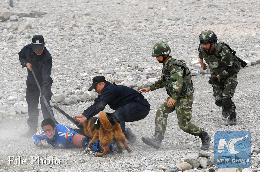 A "mobster" is controlled during a joint anti-terrorist exercise held by China and Kyrgyzstan frontier forces in Kizilsu Kirgiz Prefecture, northwest China's Xinjiang Uygur Autonomous Region, June 27, 2017. (Xinhua/Wang Fei)