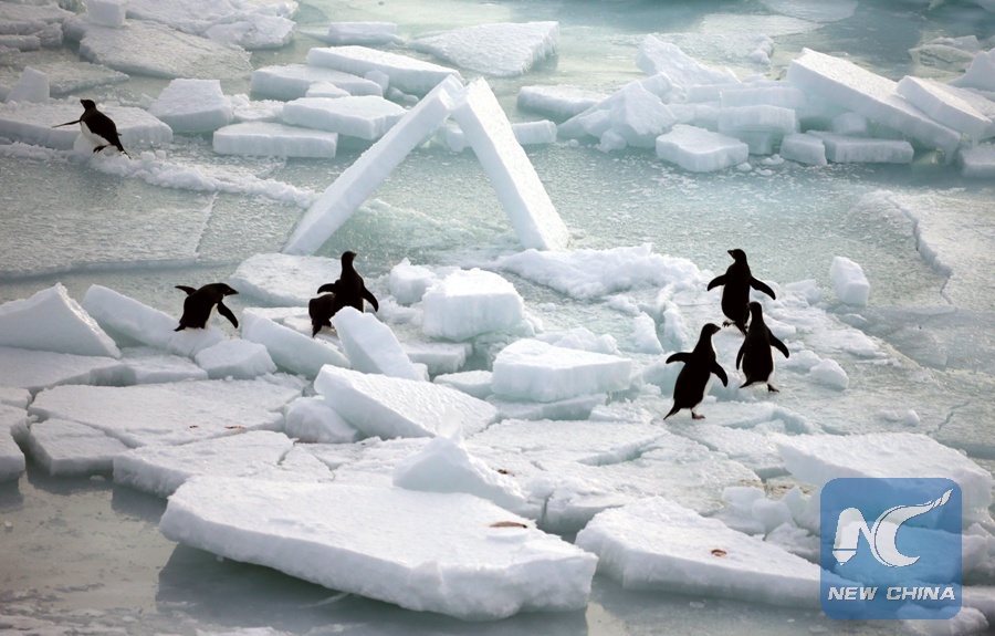 Photo taken on Dec. 5, 2017 shows penguins in the ocean surrounding Antarctica. (Xinhua/Bai Guolong)