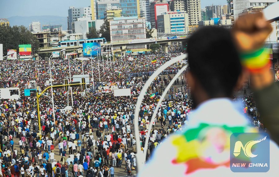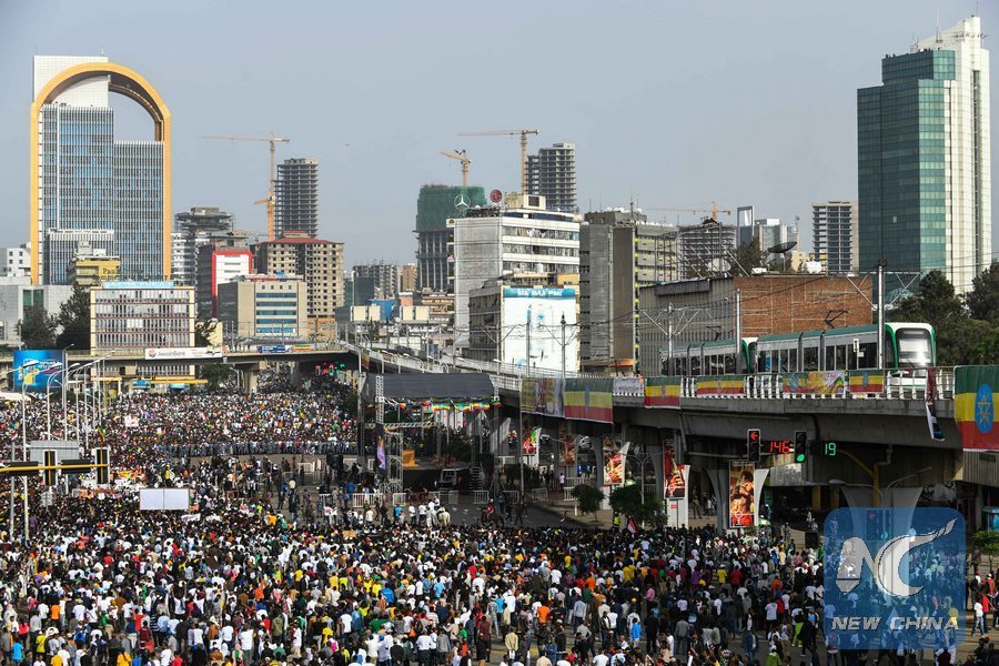 Millions of people gather at Meskel Square in Ethiopia's capital Addis Ababa on June 23, 2018 for peaceful demonstration in support of the newly elected prime minister of Ethiopia Abiy Ahmed. (Xinhua/Michael Tewelde)