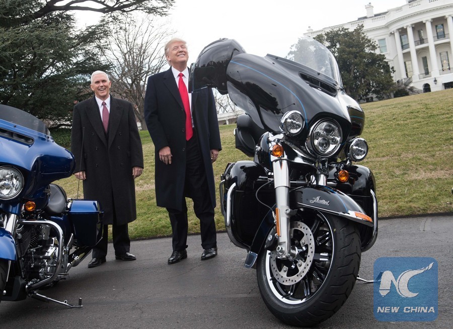 In this file photo taken on February 2, 2017 U.S. President Donald Trump jokes with reporters after greeting Harley Davidson executives and union representatives on the South Lawn of the White House in Washington, DC, prior to a luncheon with them. (Xinhua/AFP PHOTO)