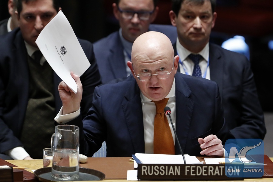 Russian Ambassador to the United Nations Vassily Nebenzia speaks at a Security Council meeting on the poisoning of former Russian double agent Sergei Skripal and his daughter Yulia Skripal, at the UN headquarters in New York, April 5, 2018. (Xinhua/Li Muzi)