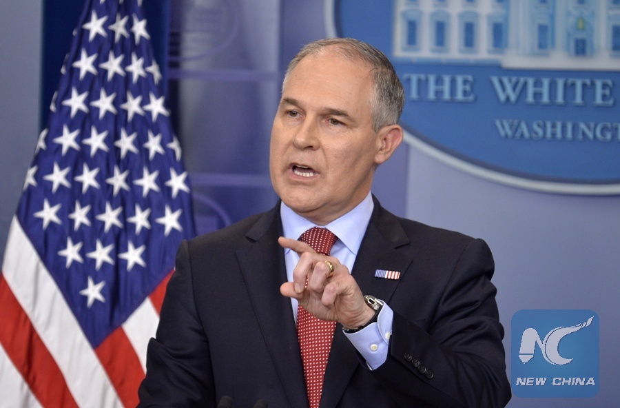 U.S. Environmental Protection Agency administrator Scott Pruitt speaks during a press briefing about President Donald Trump's decision to withdraw from the Paris Agreement at the White House in Washington D.C., the United States, on June 2, 2017. (Xinhua/Mike Theiler)