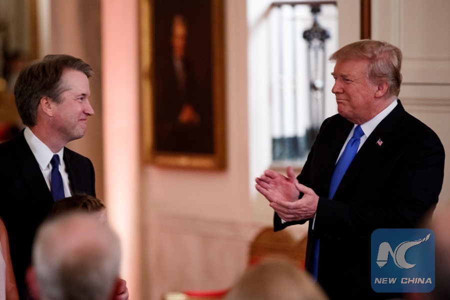U.S. President Donald Trump (R) introduces Judge Brett Kavanaugh as the Supreme Court nominee at the White House in Washington, D.C., the United States, on July 9, 2018. (Xinhua/Ting Shen)