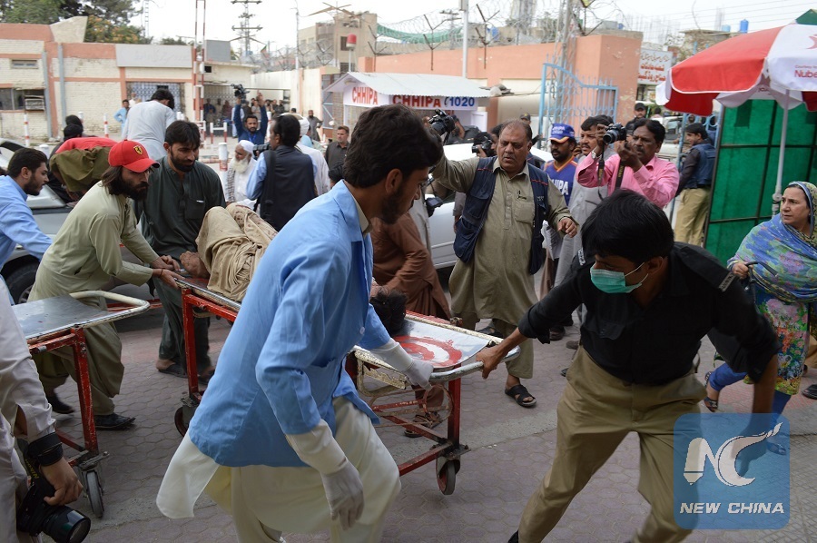People transfer an injured man to hospital in southwest Pakistan's Quetta on July 13, 2018. (Xinhua/Irfan)