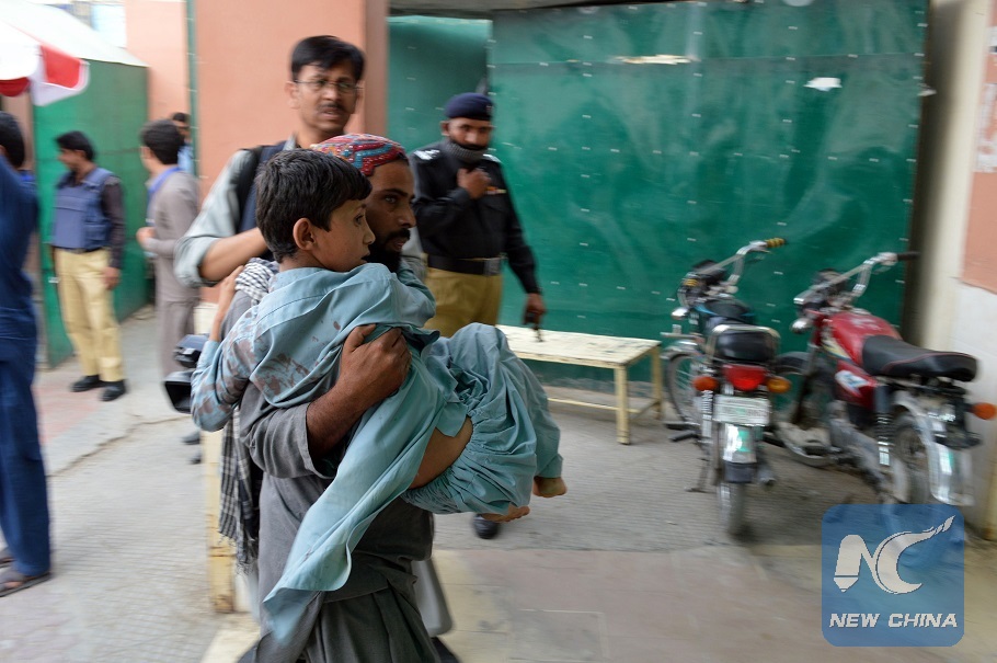 A man carries an injured child at a hospital in southwest Pakistan's Quetta on July 13, 2018. (Xinhua/Irfan)