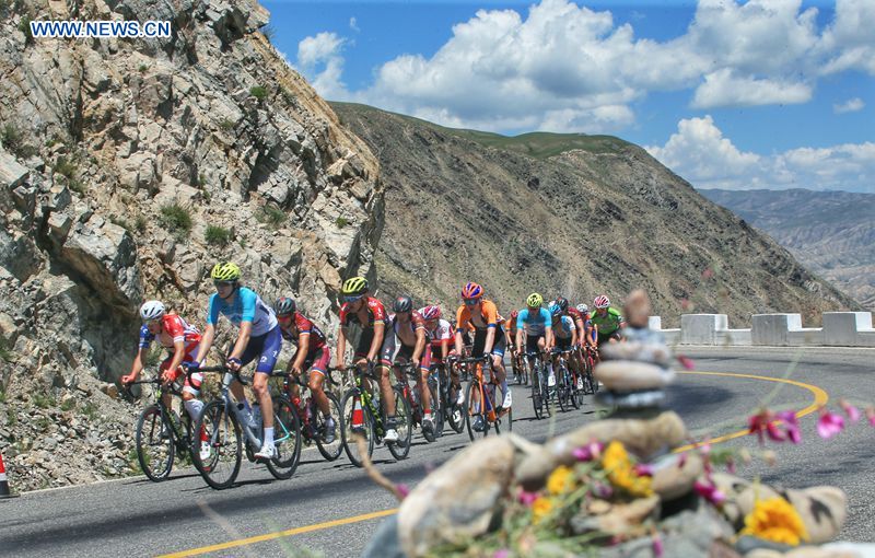 Cyclists compete in the fourth stage of the Tour of Qinghai Lake in northwest China's Qinghai Province, on July 25, 2018. (Xinhuanet Photo by Lu Mi)