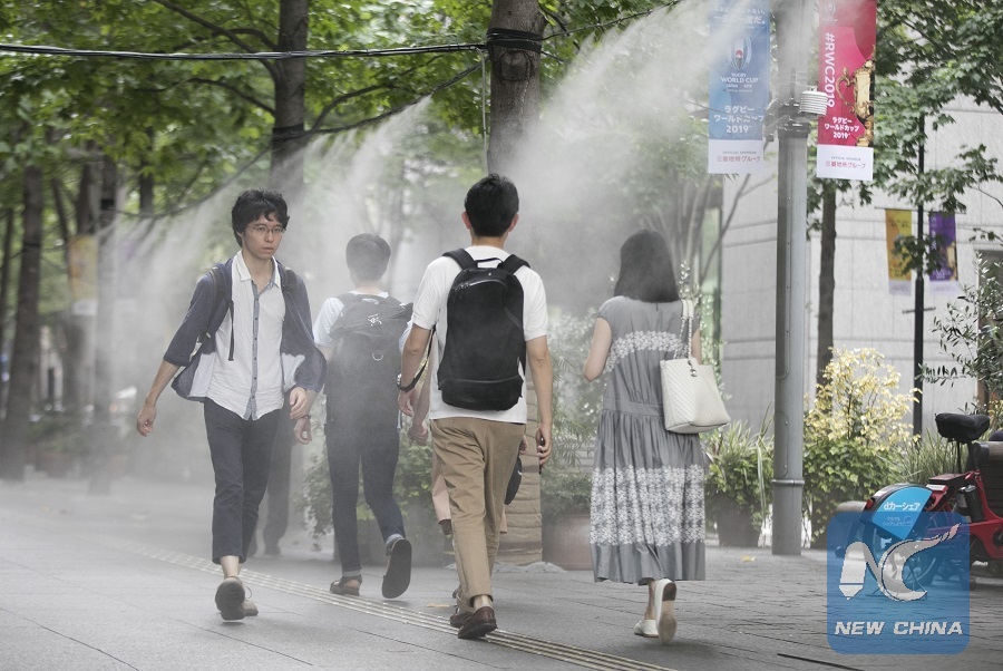 People cool off under water sprays at Chiyoda-Ku in Tokyo, Japan, on Aug. 3, 2018. (Xinhua/Du Xiaoyi)