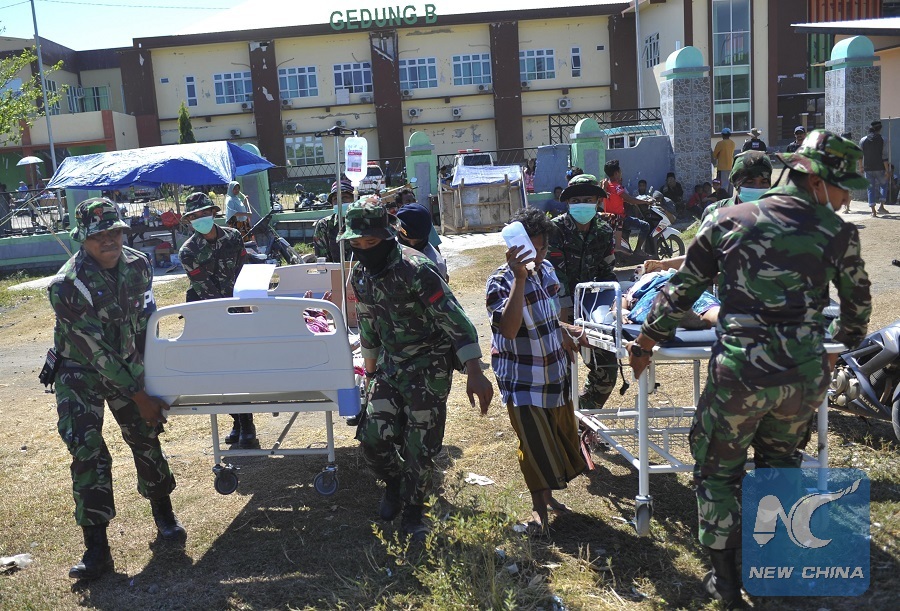 Indonesian soldiers transfer patients to an emergency tent outside the Tanjung hospital inLombok island, Indonesia, on Aug. 7, 2018. (Xinhua/Zulkarnain)