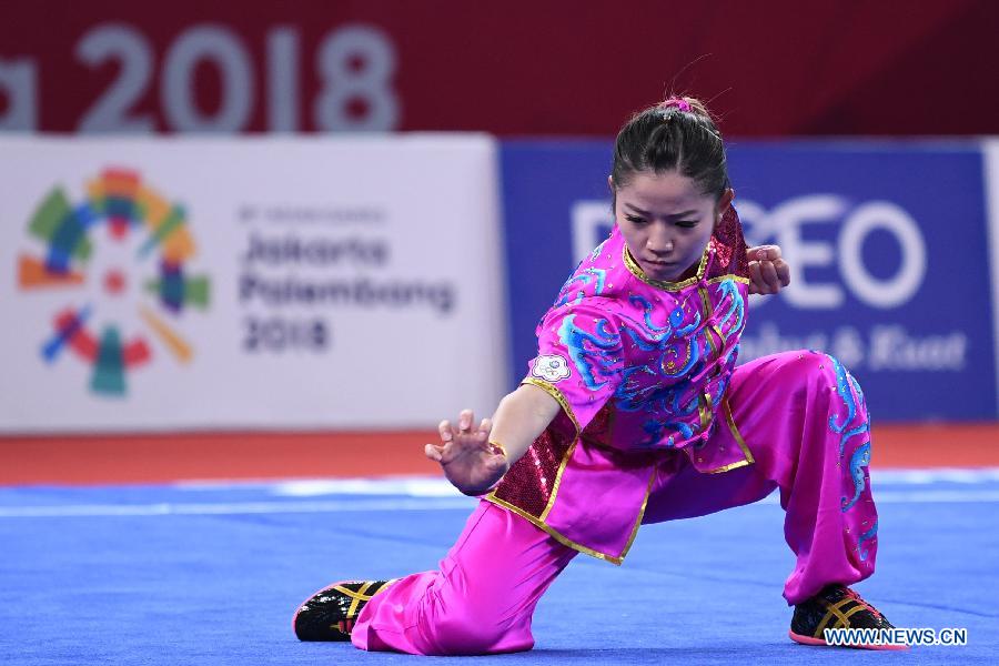 Tsai Wenchuan of Chinese Taipei competes during the Women's Nanquan & Nandao All-Round at the 18th Asian Games in Jakarta, Indonesia Aug. 19, 2018. (Xinhua/Pan Yulong)?