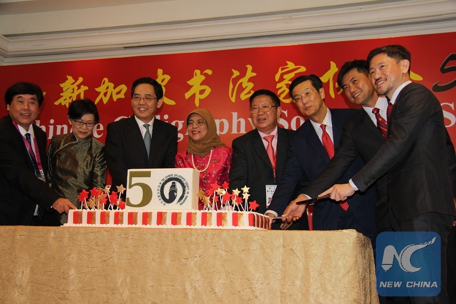 Chinese Ambassador to Singapore Hong Xiaoyong(third from the left), and Singaporean President Halimah Yacob (fourth from the left ) and President of the Chinese Calligraphy Society of Singapore Tan Siah Kwee (fifth from the left) cut the 50th birthday cake of the Chinese Calligraphy Society of Singapore. (Xinhua/Wang Lili)