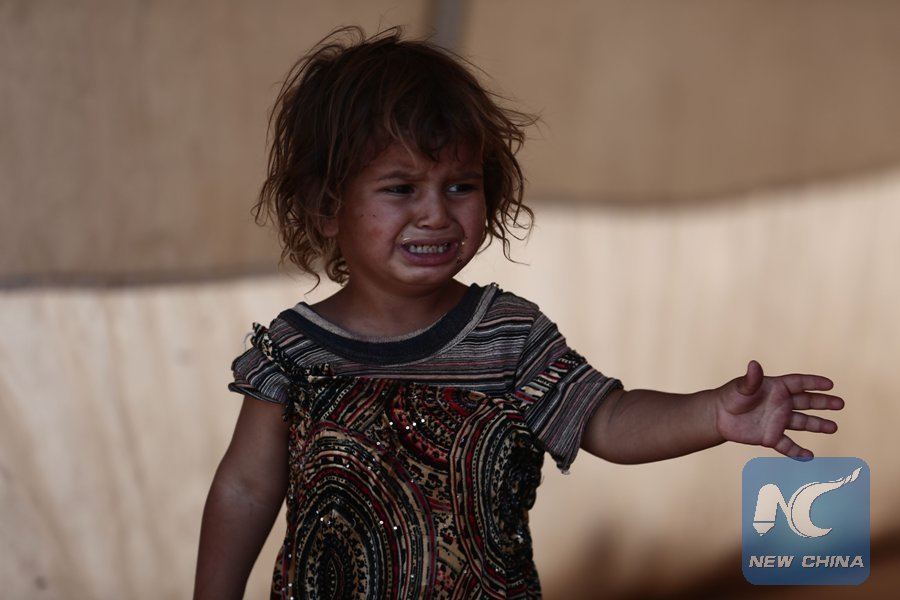 A child cries at a camp for the displaced from the rebel-held Syrian province of Idlib, at the village of al-Ghadfa, southeast of the province on Sept. 2, 2018. (Xinhua/AFP)