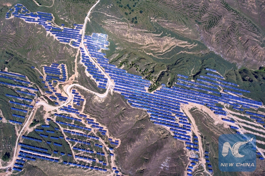 File Photo: Aerial photo taken on Sept. 4, 2018 shows a photovoltaic power plant in Loufan County, Taiyuan City, north China's Shanxi Province. In recent years, the county has vigorously developed and utilized solar energy by building photovoltaic power plants on barren mountains. (Xinhua/Cao Yang)