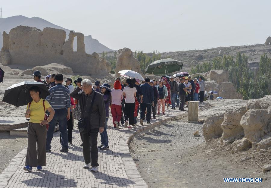Tourists visit the Jiaohe ancient city ruins in Turpan, northwest China's Xinjiang Uygur Autonomous Region, Sept. 19, 2018. Xinjiang saw more than 105 million tourists in the first eight months of 2018, up 40.93 percent year on year, according to the Xinjiang tourism development commission. (Xinhua/Zhao Ge)