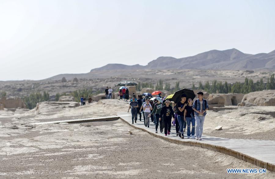 Tourists visit the Jiaohe ancient city ruins in Turpan, northwest China's Xinjiang Uygur Autonomous Region, Sept. 19, 2018. Xinjiang saw more than 105 million tourists in the first eight months of 2018, up 40.93 percent year on year, according to the Xinjiang tourism development commission. (Xinhua/Zhao Ge)