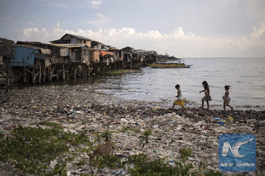 This photo taken on May 9, 2018 shows children walking along a garbage-filled bay in Manila, the Philippines. (AFP photo)