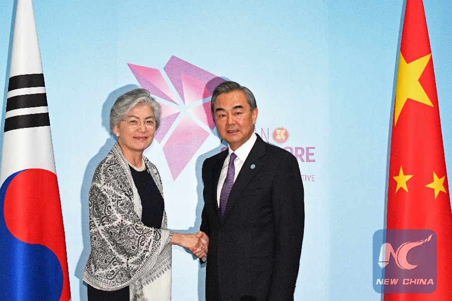 File Photo: Chinese State Councilor and Foreign Minister Wang Yi (R) meets with South Korean Foreign Minister Kang Kyung-wha in Singapore, Aug. 3, 2018. (Xinhua/Then Chih Wey)
