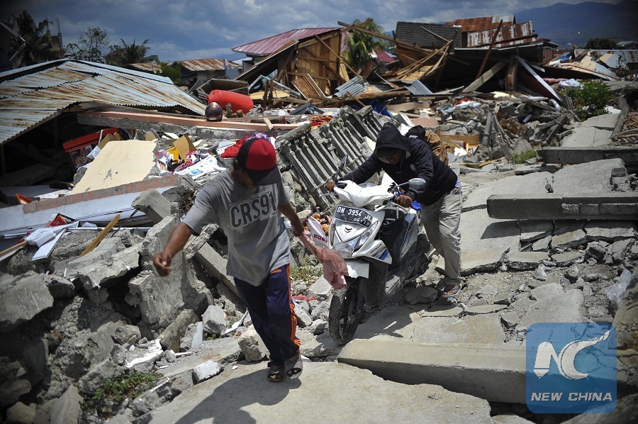 Villagers push a motorcycle on the ruins of houses in Poso of Central Sulawesi province, Indonesia, Oct. 8, 2018. (Xinhua/Zulkarnain)
