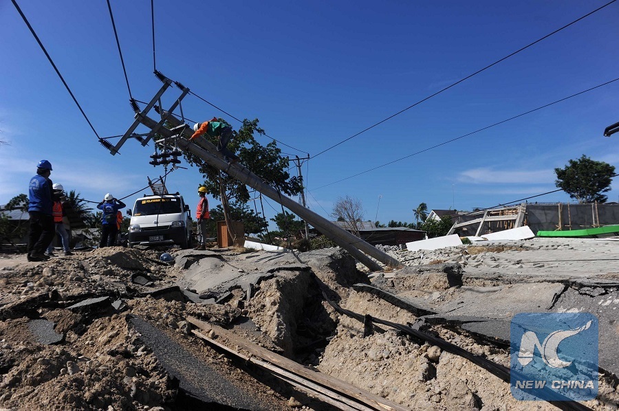 Workers check electricity installation in Palu, Central Sulawesi, Indonesia, on Oct. 5, 2018. (Xinhua/Agung Kuncahya B.)