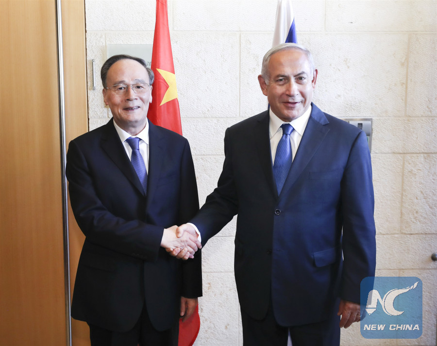 China's Vice President Wang Qishan met Israel's Prime Minister Benjamin Netanyahu in Jerusalem on Oct. 24, 2018. (Xinhua photo/Pang Xinglei)