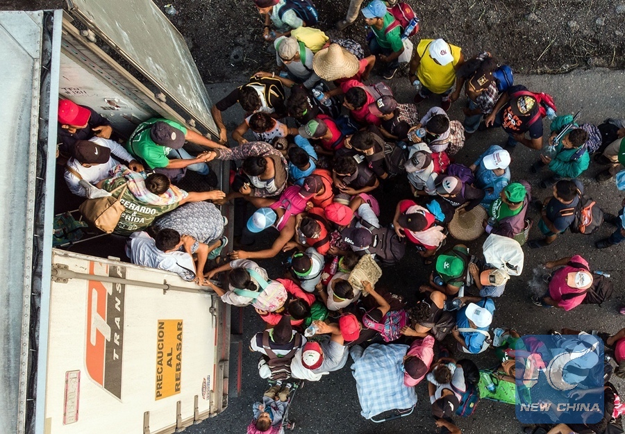 Honduran migrants taking part in a caravan heading to the United States, get on a truck, near Pijijiapan, southern Mexico on Oct. 26, 2018. (AFP Photo)
