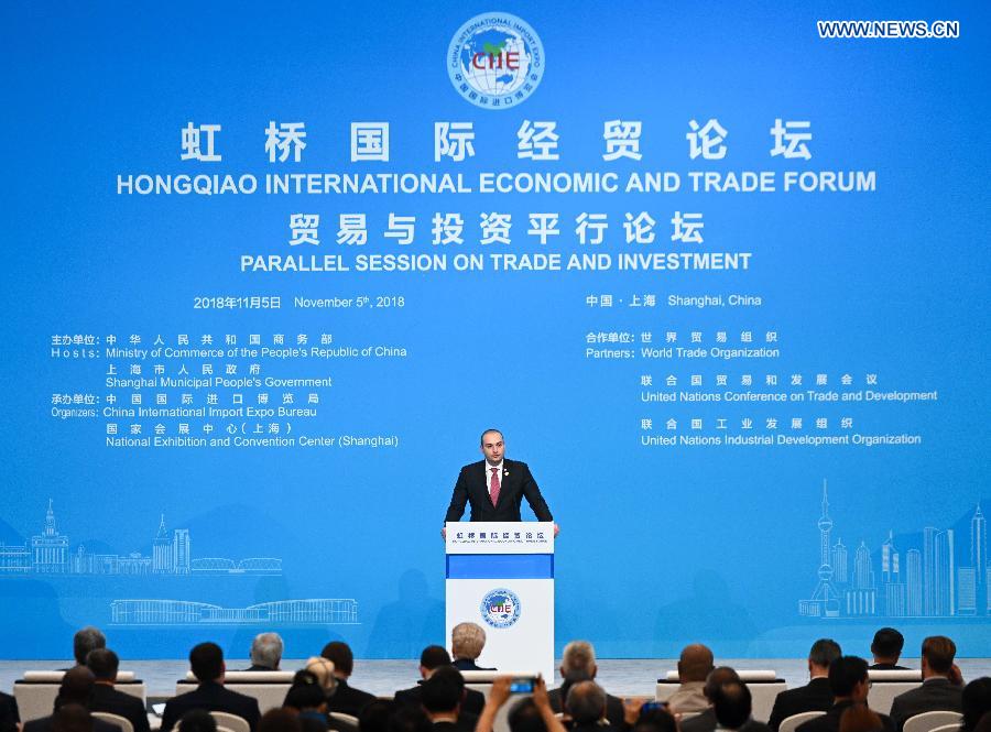 Georgian Prime Minister Mamuka Bakhtadze speaks at the Parallel Session on Trade and Investment of the Hongqiao International Economic and Trade Forum in Shanghai, east China, Nov. 5, 2018.(Xinhua/Chen Yehua)