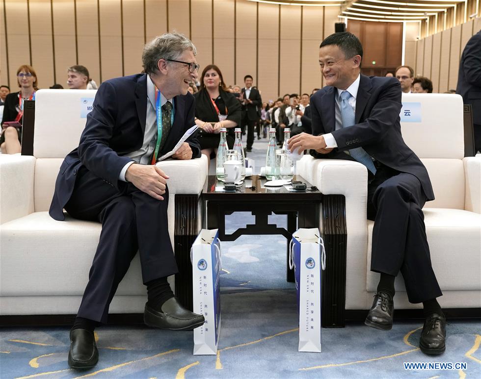Bill Gates, chairman of the board of Terra Power, LLC, and Jack Ma, executive chairman of Alibaba Group, talk ahead of the Parallel Session on Trade and Innovation of the Hongqiao International Economic and Trade Forum in Shanghai, east China, Nov. 5, 2018.