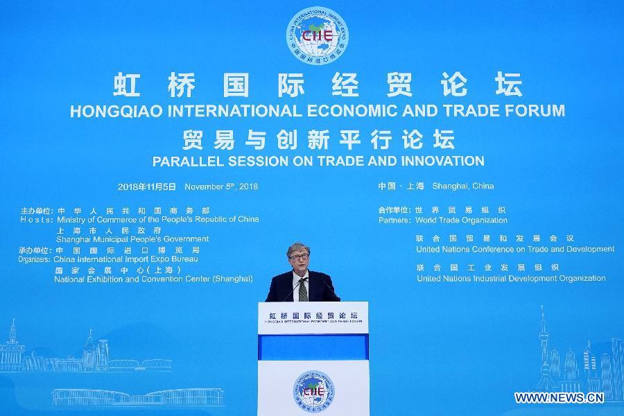 Bill Gates, chairman of the board of Terra Power, LLC, speaks at the Parallel Session on Trade and Innovation of the Hongqiao International Economic and Trade Forum in Shanghai, east China, Nov. 5, 2018.(Xinhua/Shen Bohan)