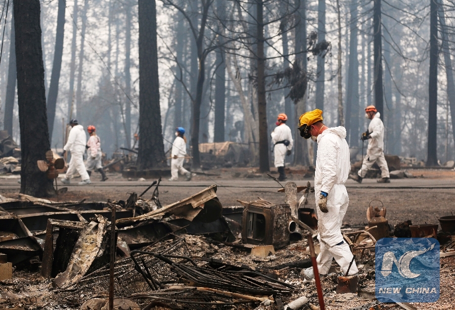 Rescuers work among debris after the wildfire in Paradise, California, the United States, on Nov. 13, 2018. (Xinhua/Li Ying)