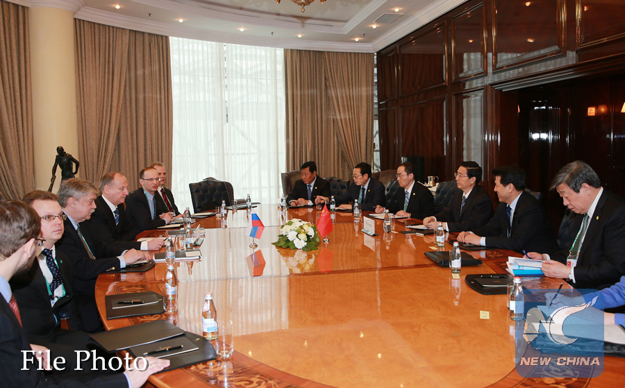Chinese State Councilor Guo Shengkun (3rd, R) meets with Russian Security Council Secretary Nikolai Patrushev (4th, L) in Moscow, Russia, April 15, 2015. (Xinhua)