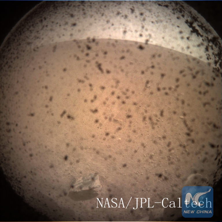 This is the first image taken by NASA's InSight lander on the surface of Mars. The instrument context camera (ICC) mounted below the lander deck obtained this image on Nov. 26, 2018, shortly after landing. The transparent lens cover was still in place to protect the lens from any dust kicked up during landing. (Xinhua/Credit:NASA/JPL-Caltech)