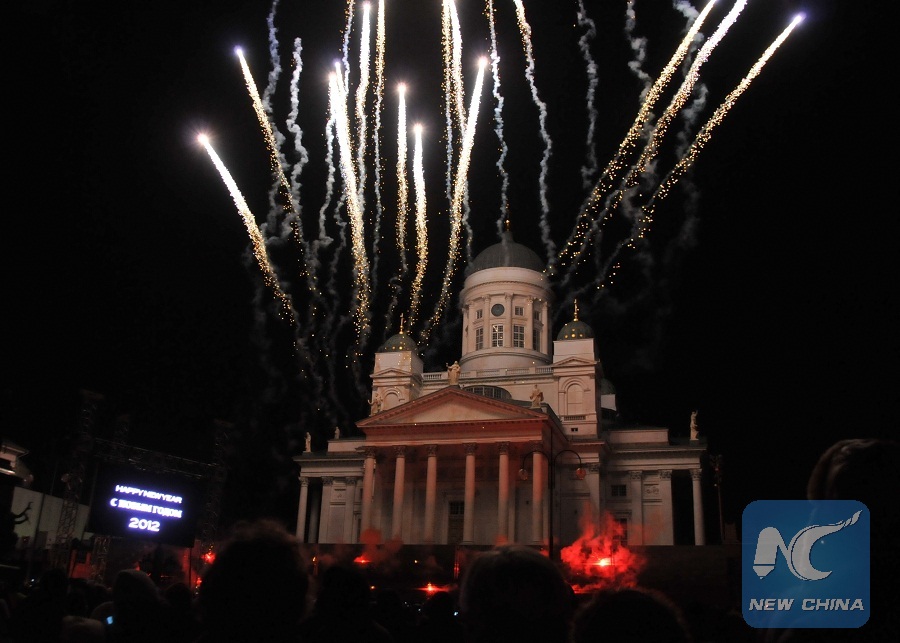 Fireworks illuminate the sky to greet the New Year in Helsinki, capital of Finland, Jan. 1, 2012. (Xinhua/Zhao Changchun)