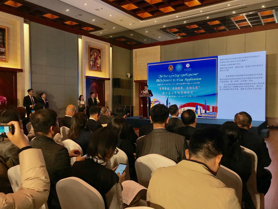 The Thai e-visa application service launch ceremony is held in the Thai embassy in Beijing on Jan. 25, 2019. (Xinhuanet/Liang Yurou)