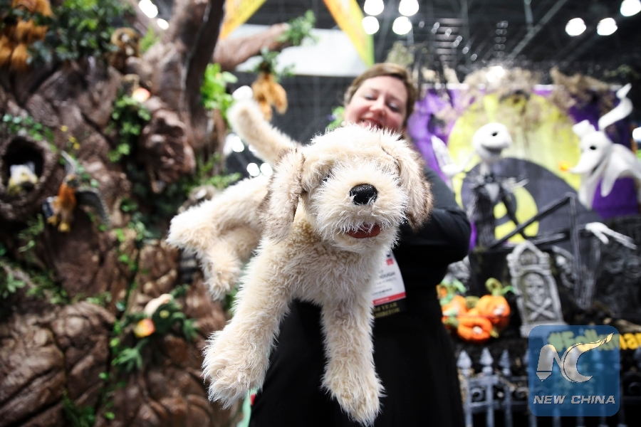 A sales person shows a stuffed toy at the 116th Annual North American International Toy Fair at the Jacob K. Javits Convention Center in New York, the United States, Feb. 16, 2019. (Xinhua/Wang Ying)