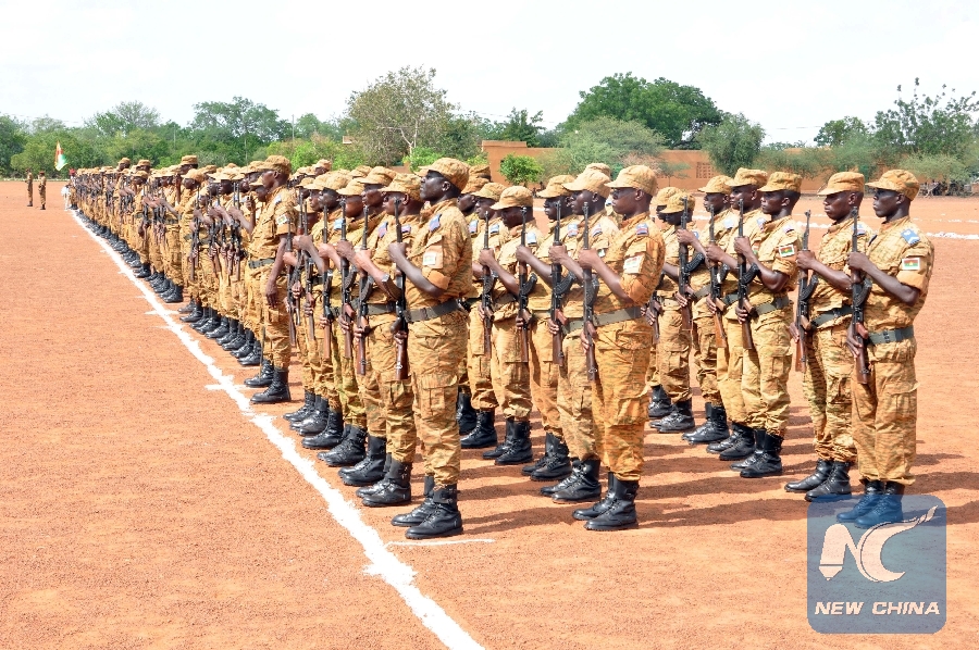 File photo taken on July 1, 2016 shows the soldiers who will carry the task of "Gondal II" at the ceremony of marking the end of military training before joining the North Mali for peacekeeping in Loumbila, a town about 20km north of Burkina Faso's capital Ouagadougou. The battalion of Burkina Faso, which has 850 soldiers, will join the Diabali, North Mali, as part of the support program to the United Nations for peacekeeping. (Xinhua/Remi Zoeringre)