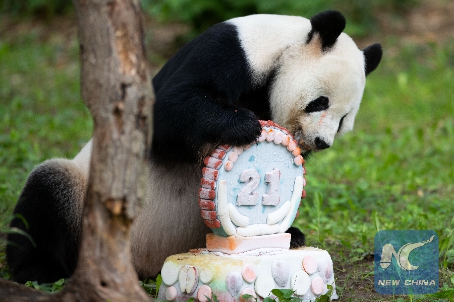 File Photo: Giant panda Tian Tian enjoys its birthday cake at the Smithsonian's National Zoo in Washington D.C., the United States, on Aug. 27, 2018. (Xinhua/Ting Shen)
