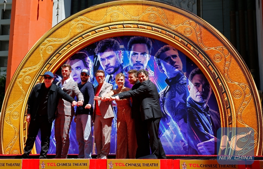 Marvels Studios president Kevin Feige, actors Chris Hemsworth, Chris Evans, Robert Downey Jr., actress Scarlett Johansson, actors Jeremy Renner, Mark Ruffalo (From L to R) attend their print ceremony in the forecourt of the TCL Chinese Theater in Los Angeles, the United States, April 23, 2019. The cast of Marvel Studios "Avengers: Endgame" including Robert Downey Jr., Chris Evans, Mark Ruffalo, Chris Hemsworth, Scarlett Johansson, and Jeremy Renner, along with Marvel Studios President Kevin Feige, received one of Hollywood's oldest accolades this Tuesday, to sign their names and put their handprints in cement at the TCL Chinese Theater IMAX in Hollywood. (Xinhua/Li Ying)