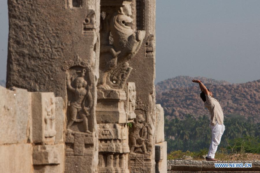A man practices yoga at Hampi in Bellary District of India's state of Karnataka, Feb. 7, 2015. China will hold the Conference on Dialogue of Asian Civilizations starting from May 15. Under the theme of "exchanges and mutual learning among Asian civilizations and a community with a shared future," the conference includes an opening ceremony and sub-forums. (Xinhua/Zheng Huansong)