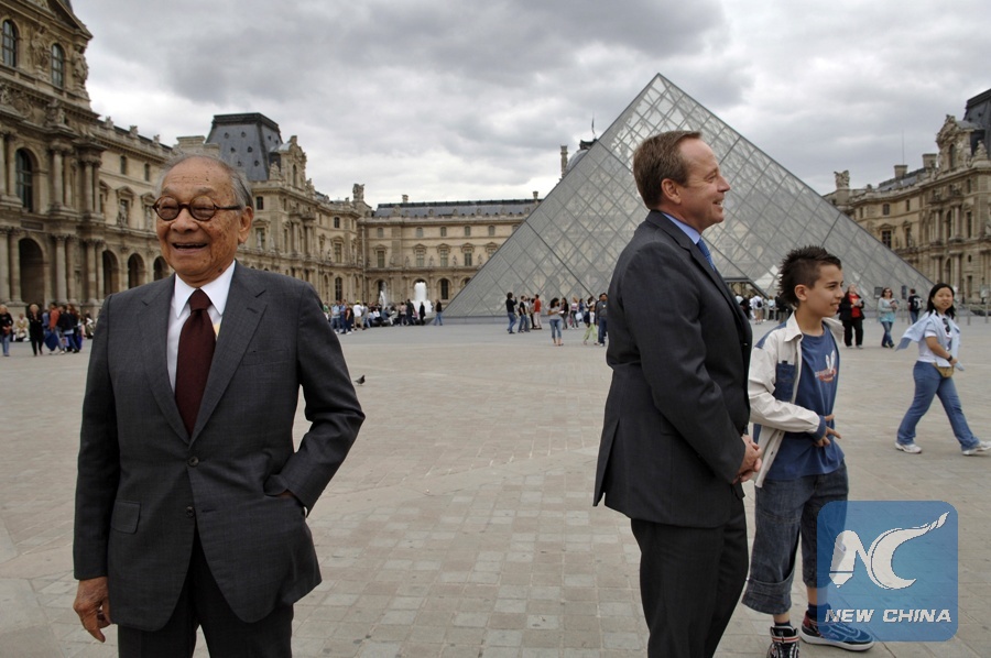 This file photo taken on June 22, 2006 in the Napoleon courtyard of the Louvre museum in Paris shows US-Chinese architect of the Louvre Pyramid Ieoh Ming Pei (L) and the French Culture Minister Renaud Donnedieu de Vabres posing for photographers. (Xinhua/AFP/Eric Feferberg)