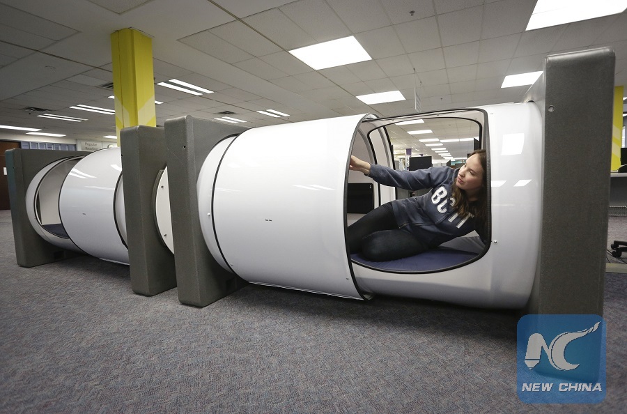 A student pulls the sliding door inside a sleep pod at the campus library of the British Columbia Institute of Technology (BCIT) in Vancouver, Canada, Aug. 5, 2016. Thesesleep pods allow students to catch a 30 to 60 minutes power nap between classes in safe and secure surroundings. (Xinhua/Liang Sen)