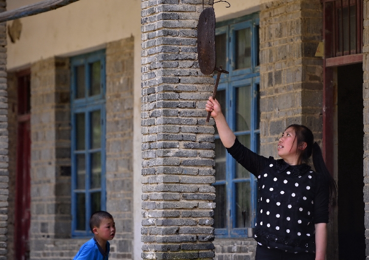 A teacher strikes an iron school bell at Liyuan Elementary School in Xikeng Village under Wanzai County of Yichun, east China's Jiangxi Province, May 20, 2014. (Xinhua/Zhou Mi)