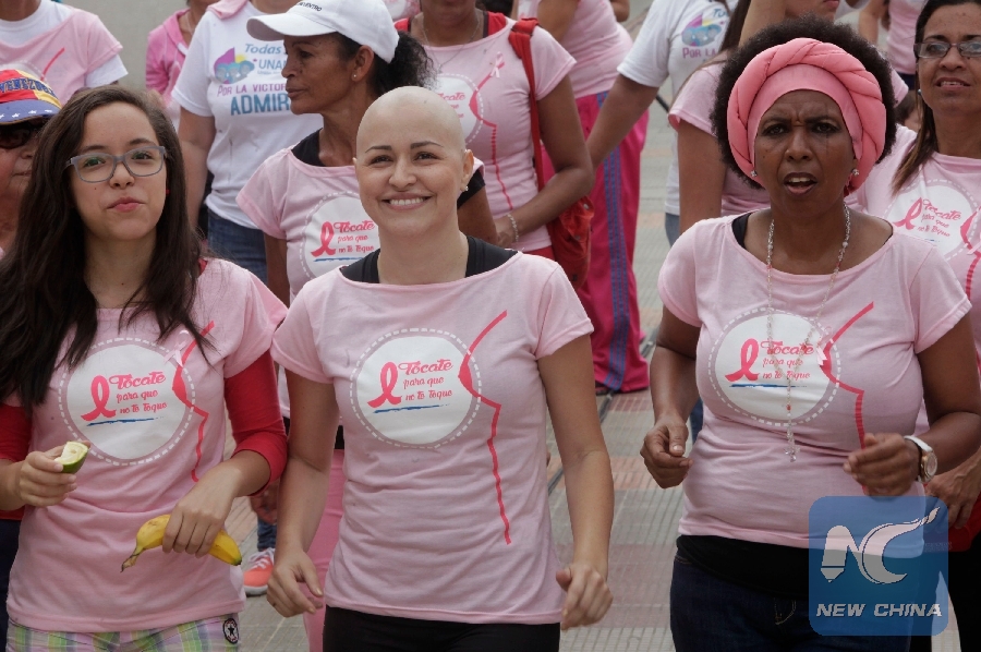 Women take part in a march against breast cancer in Caracas, Venezuela, on Oct. 16, 2016. October is the International Breast Cancer Awareness Month. (Xinhua/AVN)