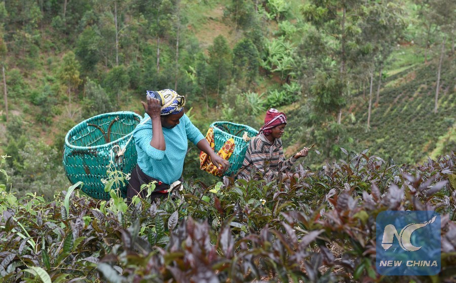 Farmers pick purple tea leaves at a tea garden near Nairobi, capital of Kenya, June 16, 2017. Kenya introduced purple tea about four years ago. (Xinhua/Li Baishun)