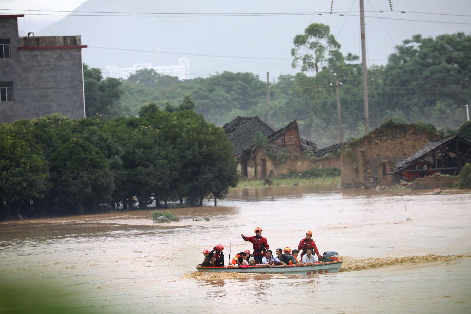 Rescuers transfer people at Zhaojia Village of Quanzhou County in Guilin, south China's Guangxi Zhuang Autonomous Region, June 9, 2019. (Xinhua/Wang Zichuang)
