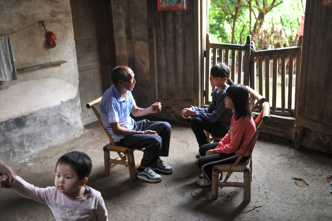 Villager Xie Nanjing tells story of martyr Deng Yigang to his granddaughters at home in Shihan Village, Kuantian Town, Yudu County, east China's Jiangxi Province, June 13, 2019. (Xinhua/Zhou Mi)