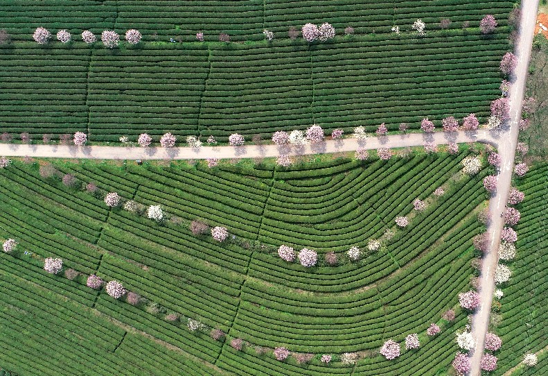 Aerial photo taken on March 19, 2019 shows a tea garden at the Fenghuanggou scenic spot in Nanchang County, east China's Jiangxi Province. (Xinhua/Peng Zhaozhi)