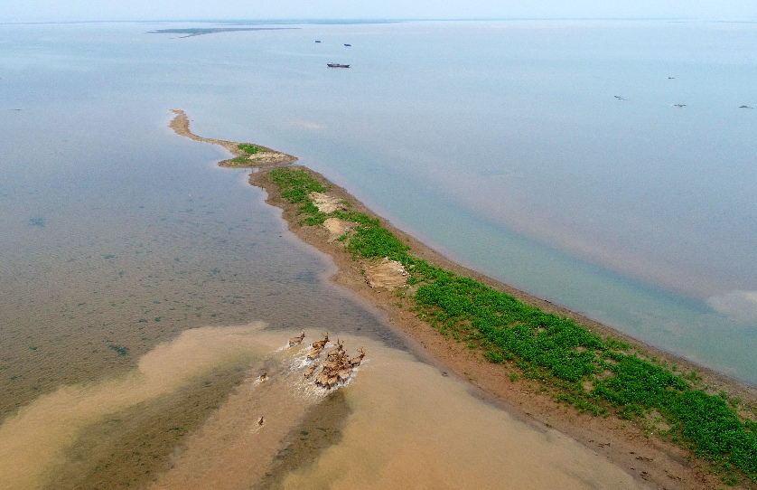 Aerial photo taken on April 3, 2018 shows a herd of milu deer running on the Poyang Lake wetland in east China's Jiangxi Province. (Xinhua/Zhou Mi)