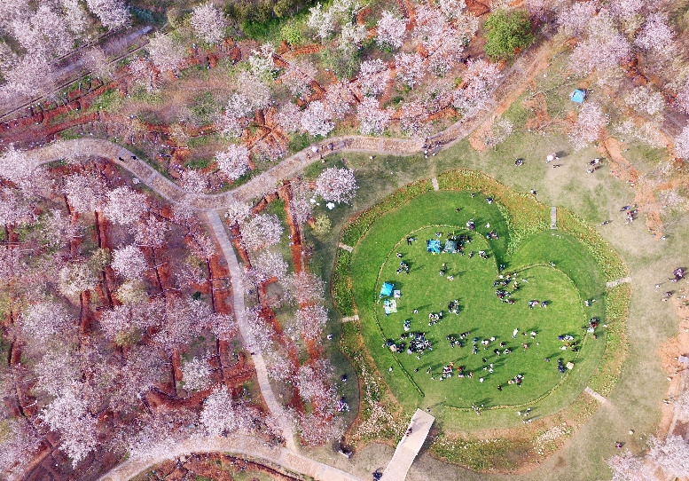 Aerial photo taken on March 26, 2017 shows tourists resting at the Fenghuanggou scenic spot in Nanchang County, east China's Jiangxi Province. (Xinhua/Wan Xiang)