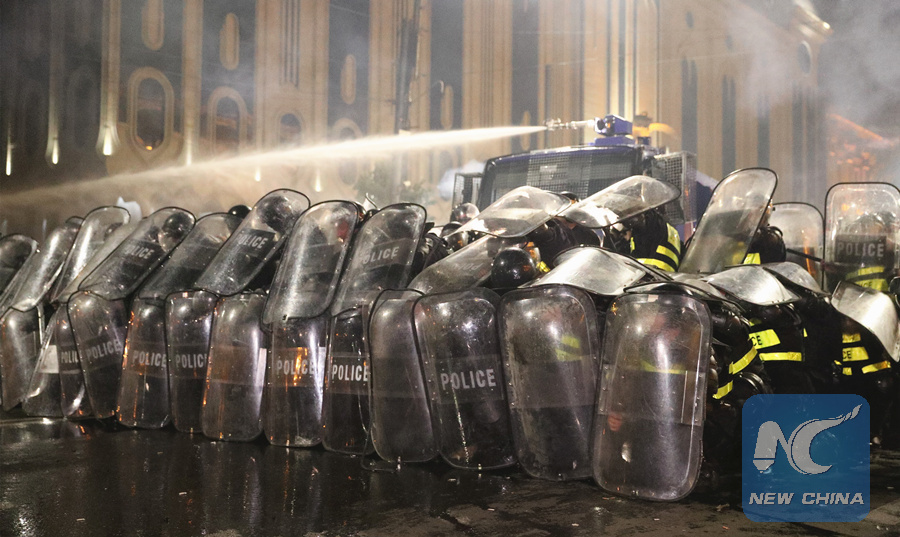 The clashes between protesters and law enforcement officers began on Thursday during an ongoing rally at the Rustaveli Avenue in downtown Tbilisi in front of the parliament.