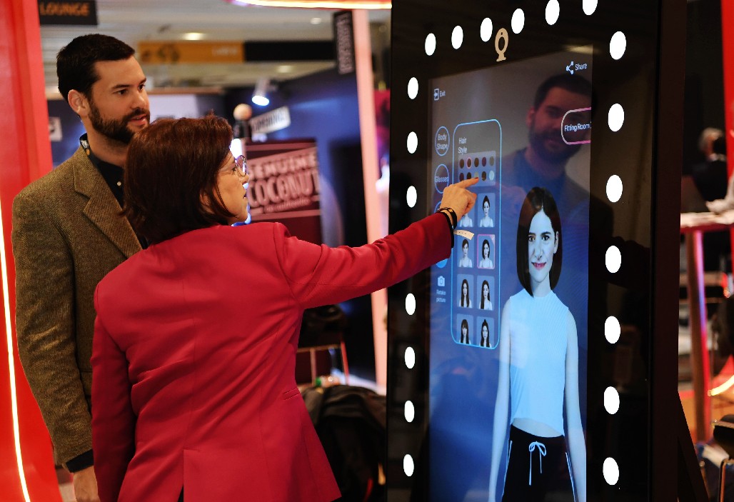 A Spanish volunteer helps a visitor to try virtual clothes via Tmall's "magic mirror" at the World Retail Congress in Madrid, Spain, on April 17, 2018. (Xinhua/Guo Qiuda)
